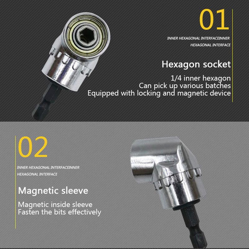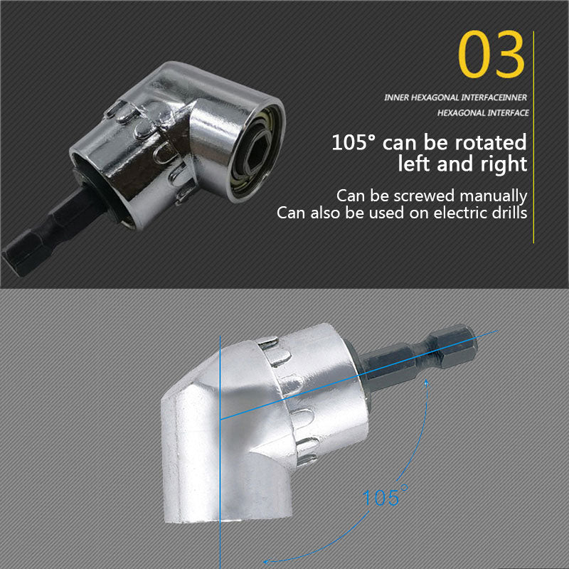 - ✅ 105 degree angle extension for use when you are in hard to reach places, 360 degree adjustable thumb flange. Hand drill and hand wrench can be connected. The functional head is equipped with a magnetic and locking device to ensure that the sleeve does not fall off. Built-in strong magnet with good holding power accepts all standard 1/4" hex bits. Fits all drills, socket wrenches and drill bit wrenches without obstructing access or tight spaces.
