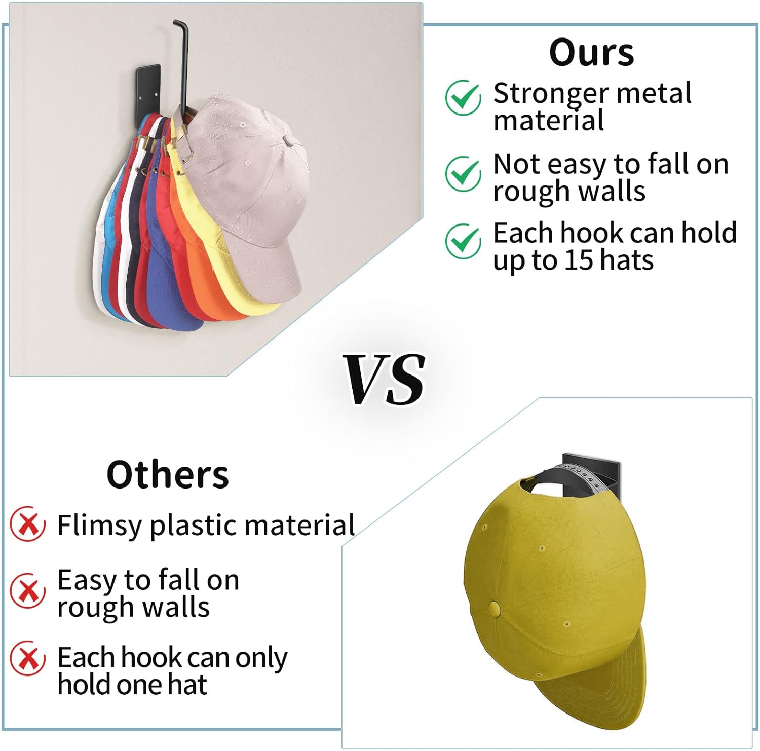 ✅【Durable】--This baseball cap organizer is made of high qual Hat hooks ensure long term installation, hang your hat safely and securely, no more worrying about your hat always falling to the floor!ity metal that is sturdy and durable. Each hook can hold up to 10 pounds.