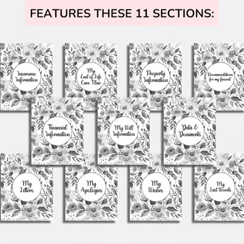 Our thorough and funny End of Life Planner covers everything your family and/or friends will need to know upon your passing or incapacitation.... from Financial Information to Insurance Information to End Of Life Care Wishes and more!
