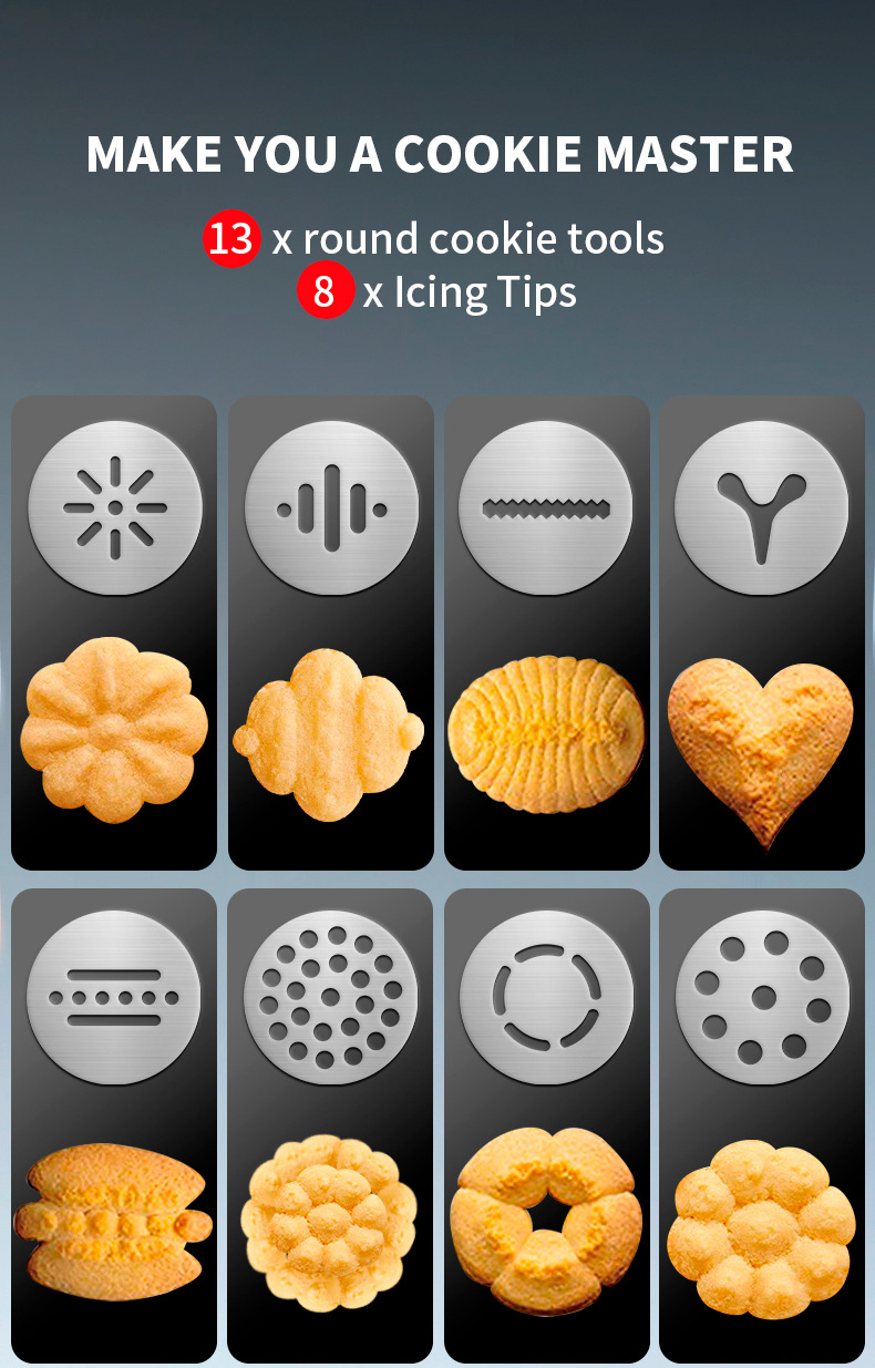 【Full Cookie Pressing Gun Set】The products mainly include: 1 stainless steel cookie DIY piping gun, 8 stainless steel piping tips and 13 round metal shape pattern hollow pieces to meet different needs.